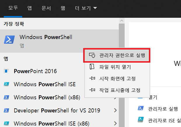 1. powershell을 마우스 우클릭 후 관리자 권한으로 실행