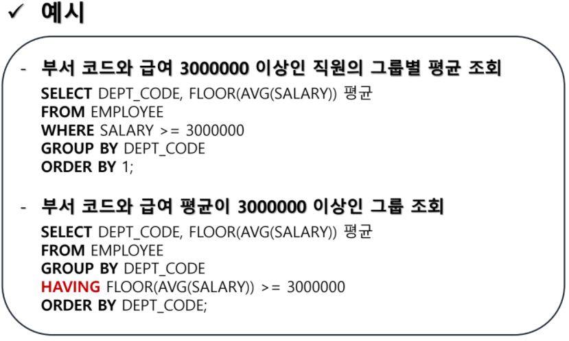 그룹 함수로 값을 구해올 그룹에 대해 조건을 설정할 때 HAVING절에 기술합니다.
