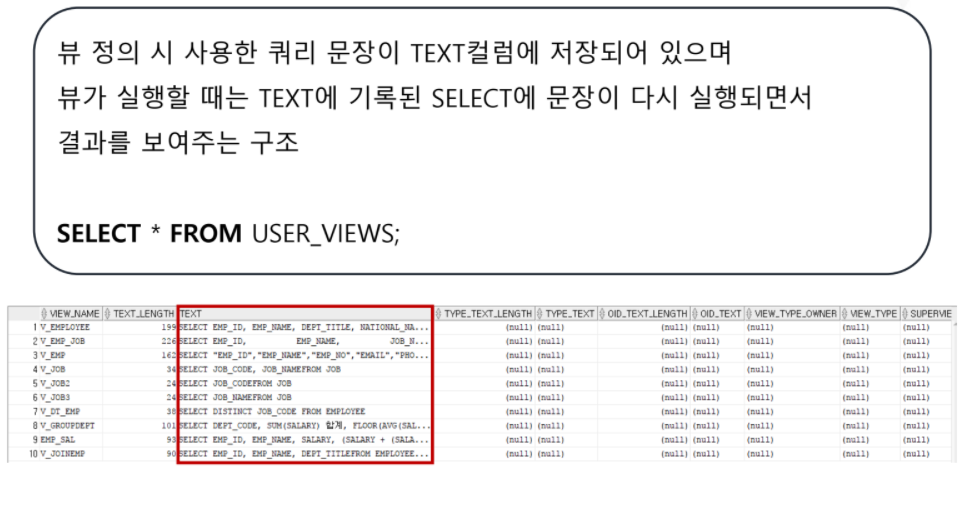 - 기존의 테이블에서 파생된 것이 VIEW 입니다. 따라서 기존 테이블 보호를 할 수 있습니다.
