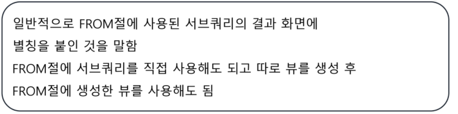 SELECT 쿼리의 실행 결과를 화면에 저장한 논리적 가상 테이블입니다.