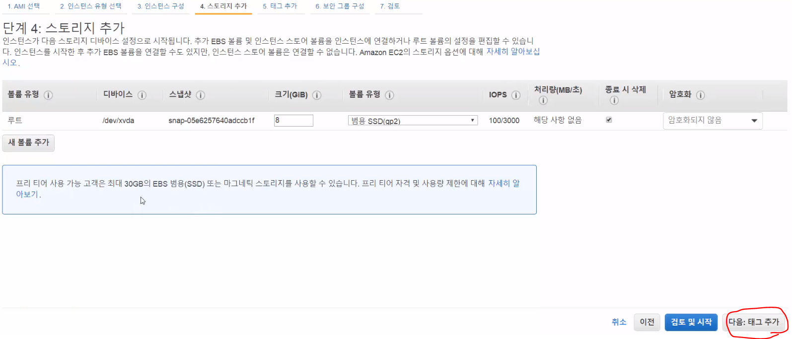 스토리지 추가에서 크기를 지정해주고 다음으로 넘어갑니다.