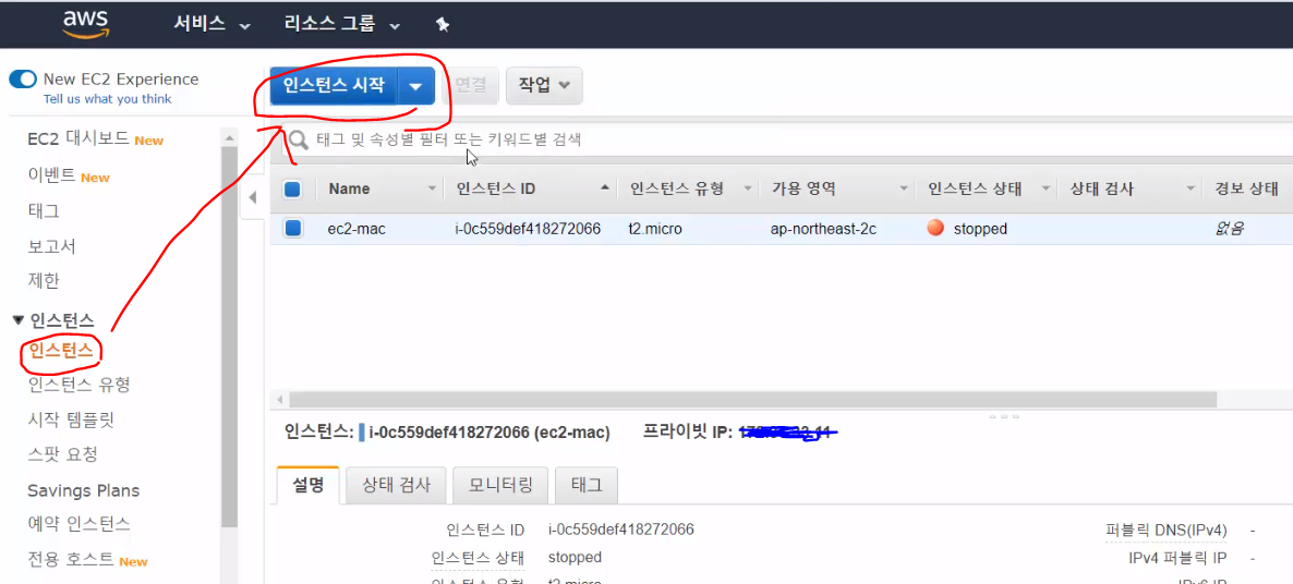 사이드바에 인스턴스에서 인스턴스 시작을 누릅니다.