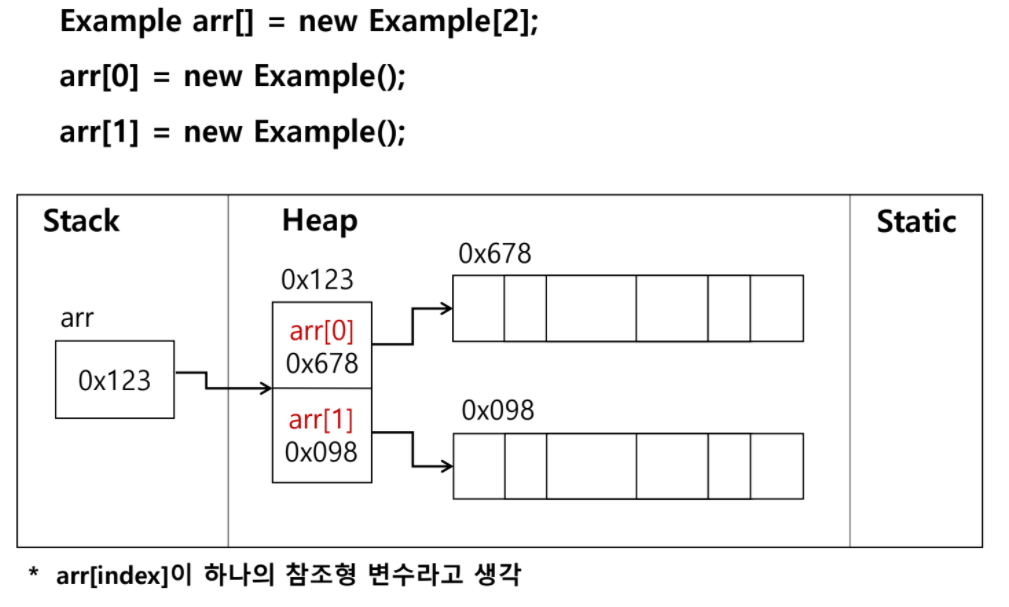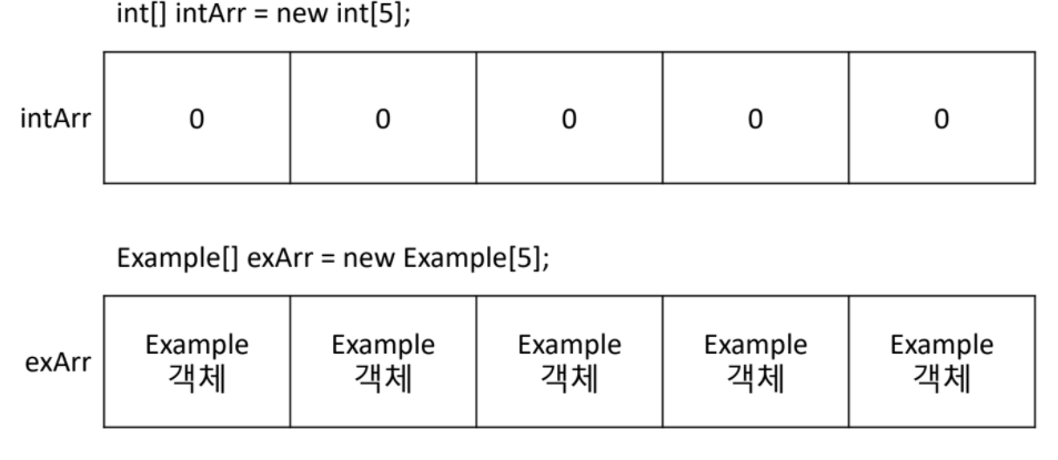 정의된 Example객체에 대해 exArr이라는 객체 배열을 생성하고, 그 크기는 5만큼 지정해 주었습니다.