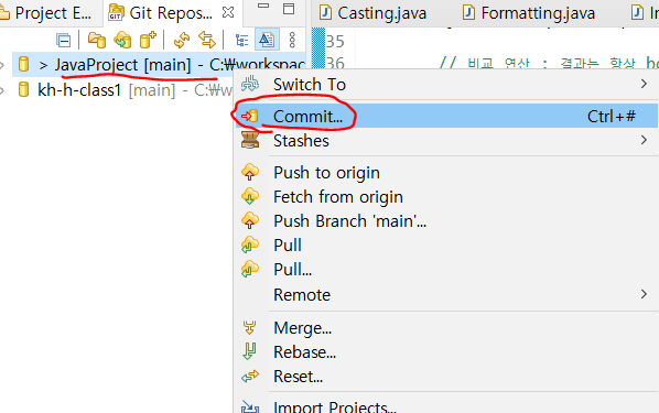 3. 'commit' 명령어를 통해 git 원격 저장소에 eclipse 파일을 저장