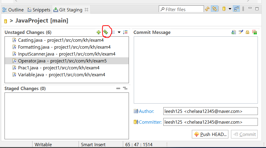 여기서 Unstaged Changes 하는 건 작성 및 수정된 파일들입니다.