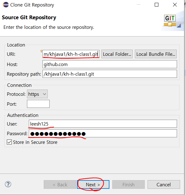 ※ 바로 아래에 Store in Secure Store를 눌러주면 후에 Repository를 불러오고자 하면
