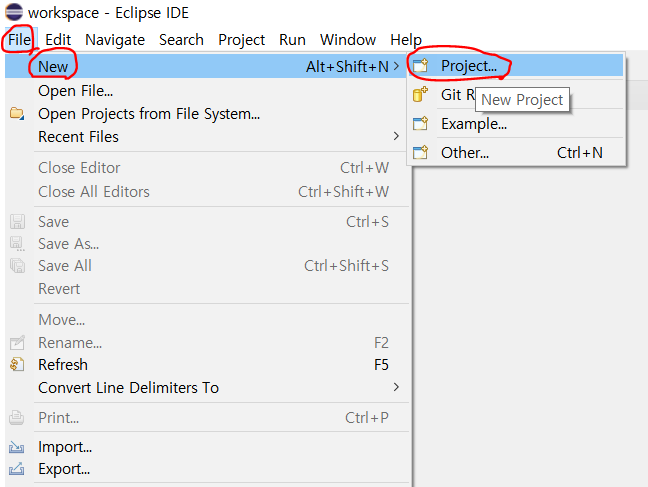 화면 상단 좌측에 File -> New -> Project를 클릭합니다.
