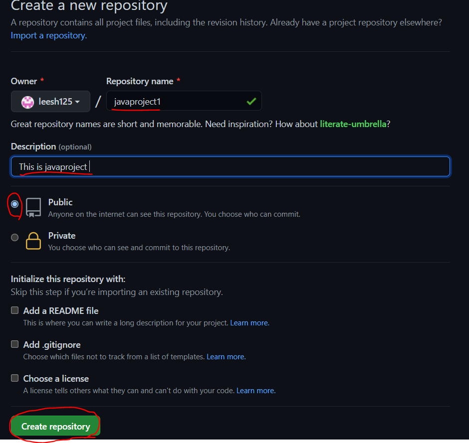 1. Repository name (저장소 이름) 을 지정하고 작성해줍니다.
