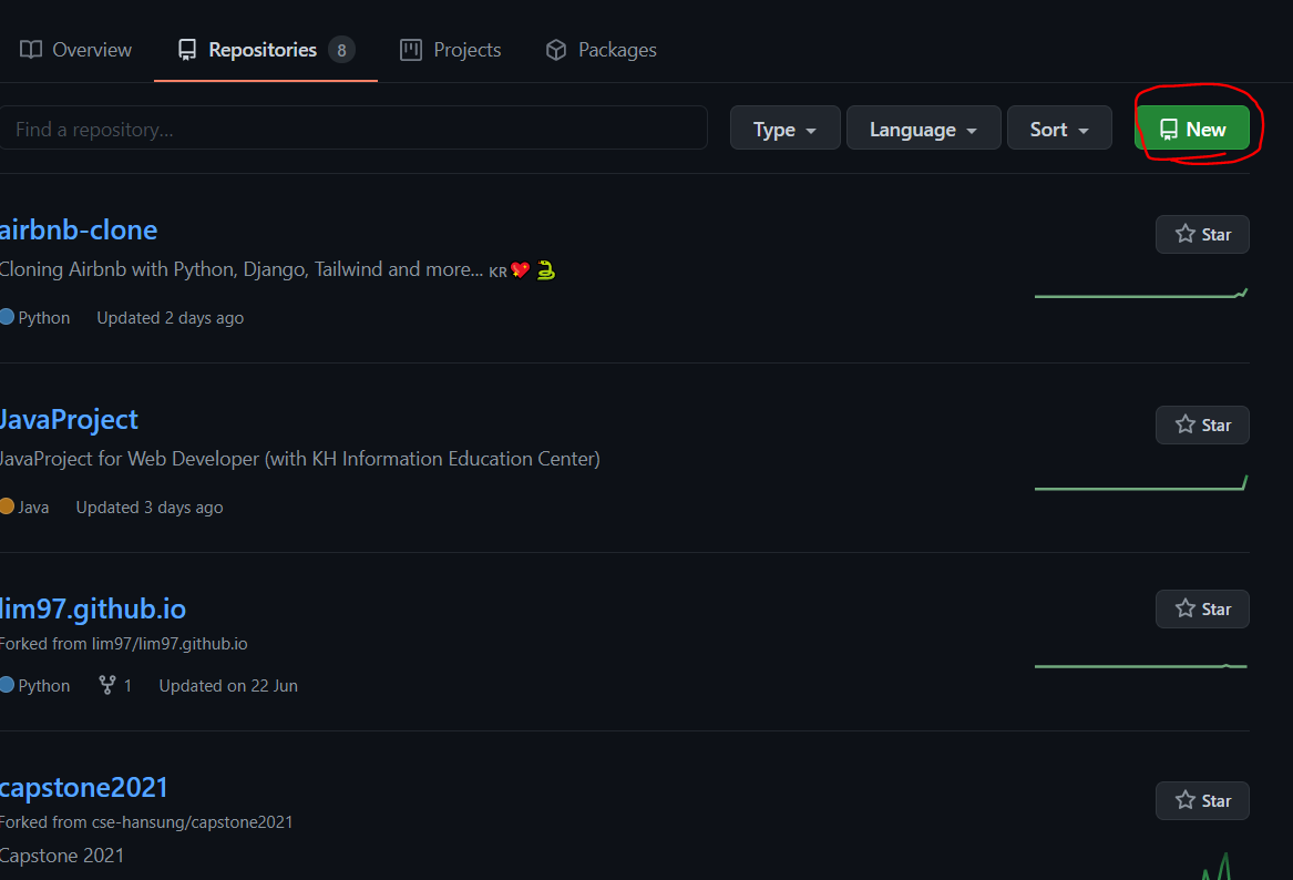 Repository 페이지에서 New를 클릭합니다.