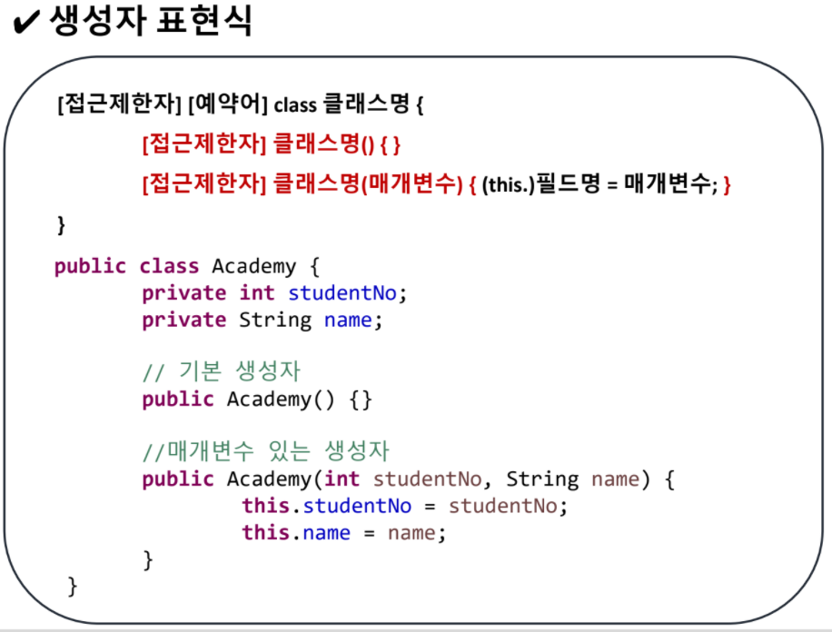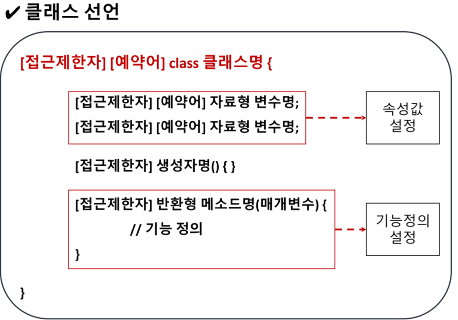 여기서 접근 제한자와 예약어가 생소할 수 있는데요.