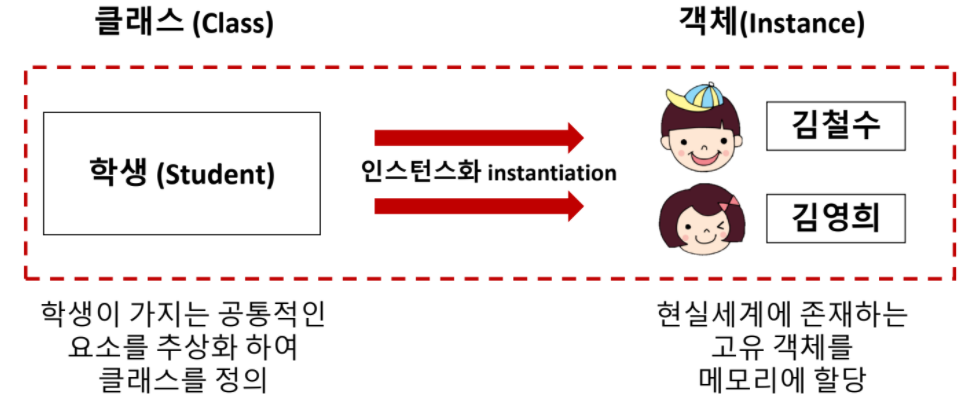 객체 지향 언어에서 객체의 개념은 클래스에 정의된 내용대로 메모리에 할당된 결과물(Object) 입니다.