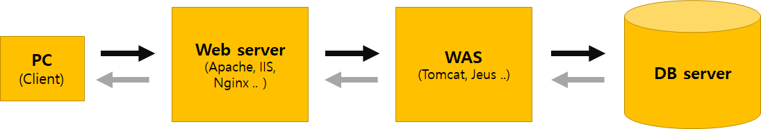 결론적으로 Pc-> Web server -> WAS -> DB (여기까지 요청) -> WAS -> Web server -> Pc (응답)