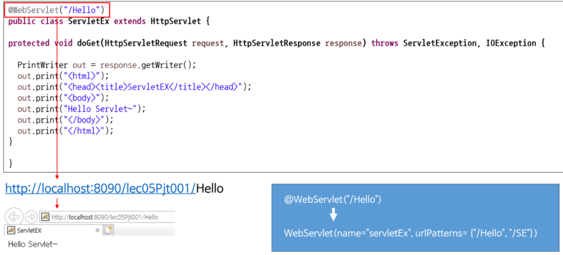 servlae-name -> servletEx , urlPatterns = /Hello