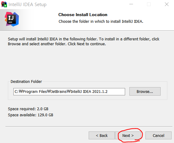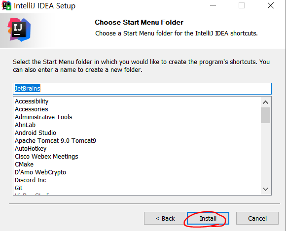 시작 메뉴 폴더는 JetBrains로 선택하고 Install을 눌러줍니다.
