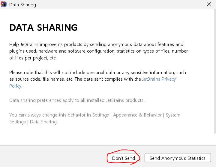 Data Sharing에 관해 묻는 것인데 Don't send 를 눌러줍니다.