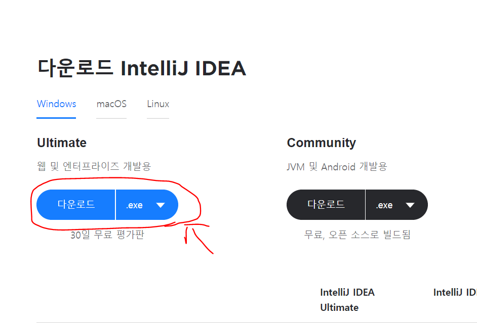 그중에서도 Spring을 지원하기에 Ultimate 버전으로 다운로드합니다.