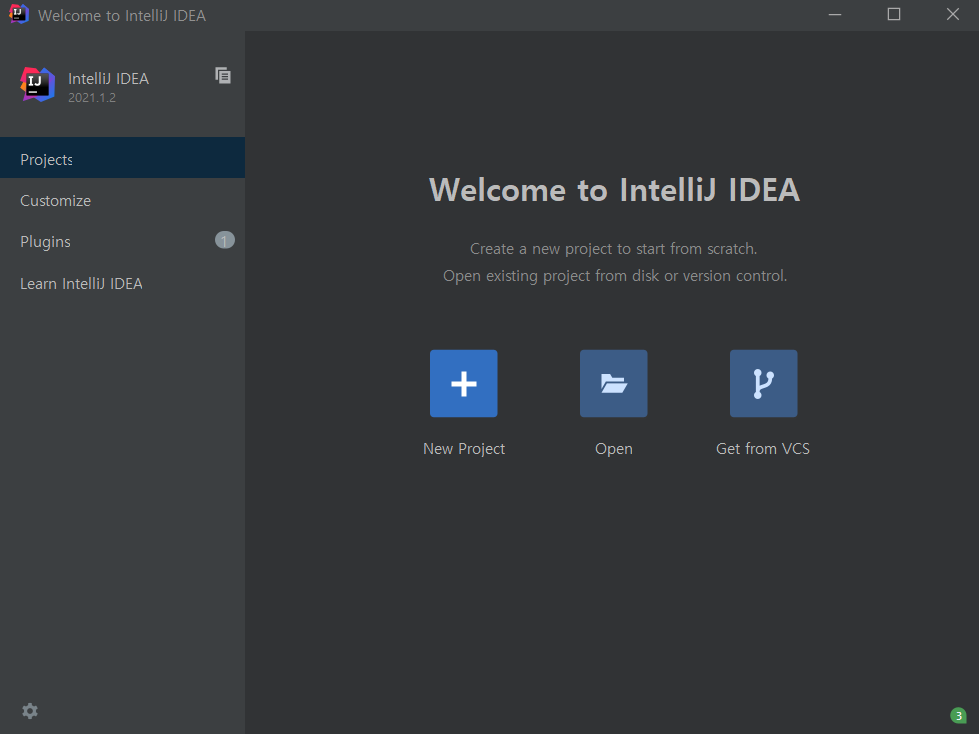 여러 과정을 거치고 IntelliJ를 실행하면 다음과 같은 창이 뜹니다.