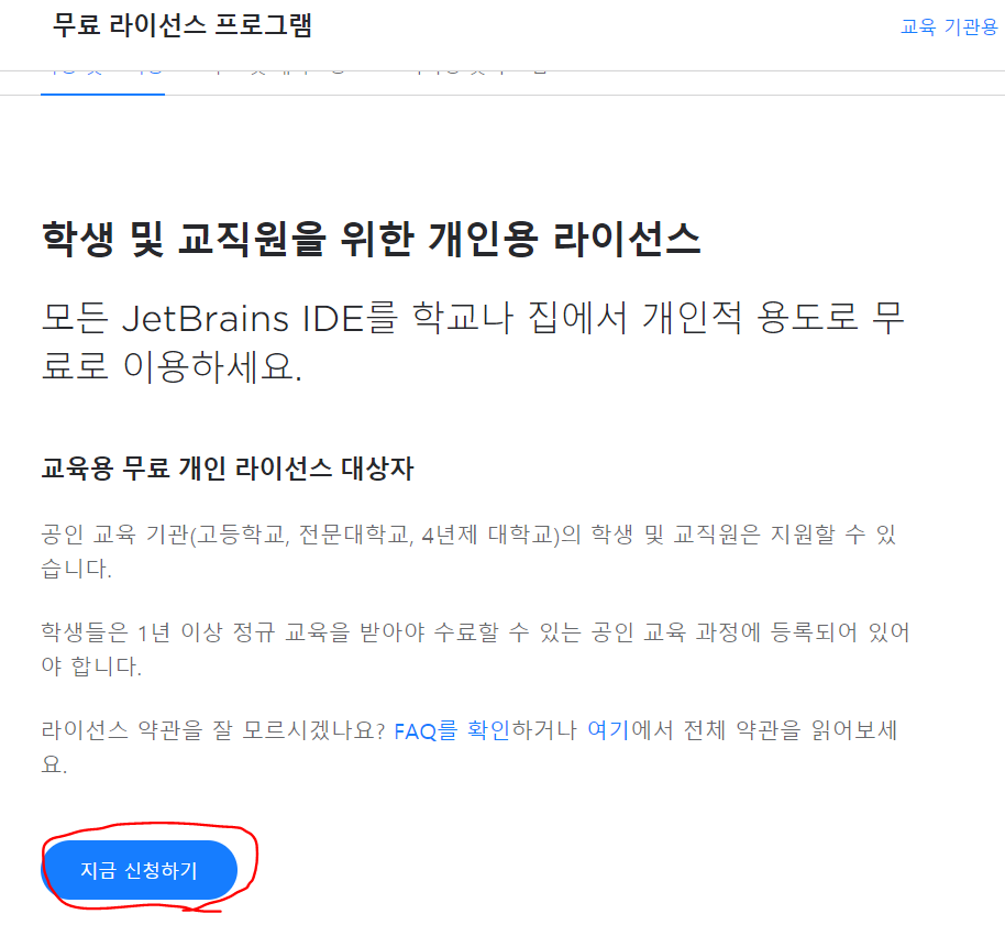 화면을 아래로 내리면 다음과 같은 화면이 나오는데, '지금 신청하기'를 눌러줍니다.