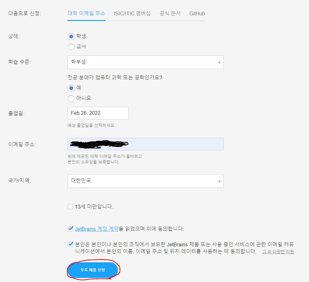 ※이때 대학생 신분이라면, 본인의 학교 email을 넣어주면 1년간 무료로 사용이 가능합니다.