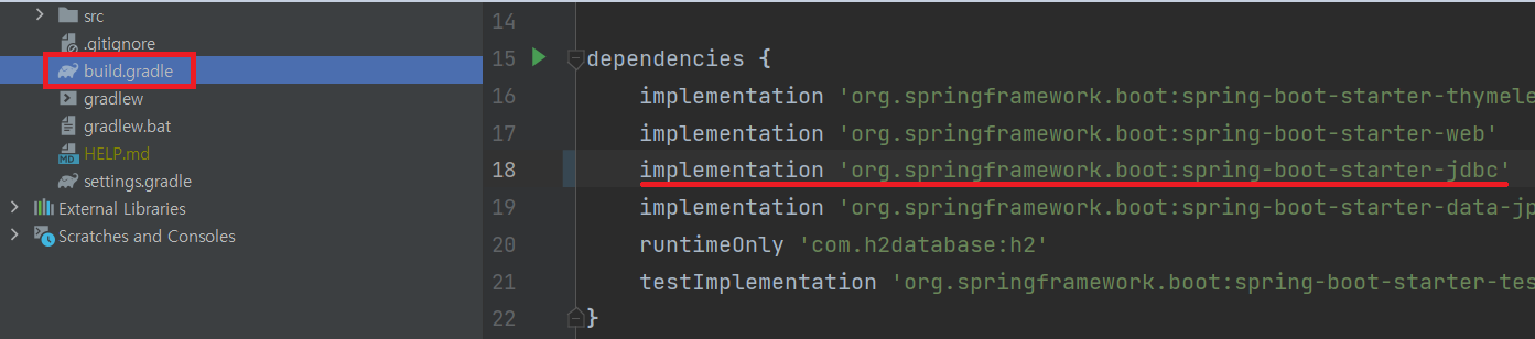 밑줄 친 코드를 삽입해준다. (spring에서 jdbc를 사용하는 dependency)