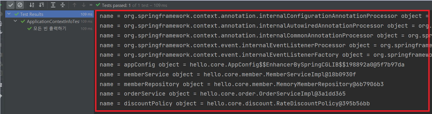 참고로 AppConfig에 등록된 스프링 빈들은 아래와 같다.