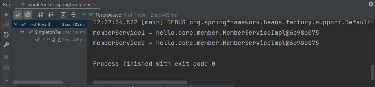 memberService를 두 개 생성하고 이 둘의 참조값이 같은지 비교해봤다.