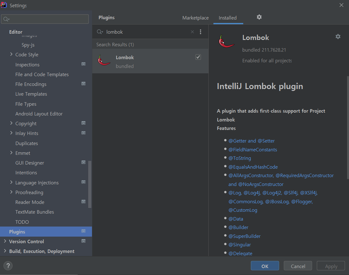 윈도우(Windows) : File > Settings > Plugins > lombok 검색 및 설치
