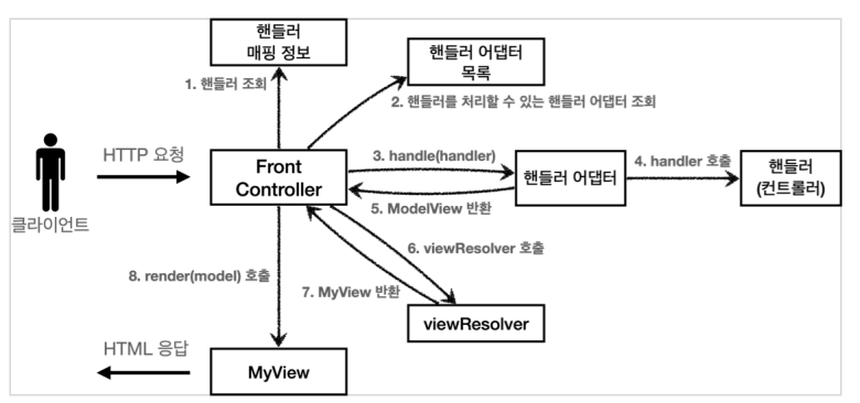 핸들러: 컨트롤러의 이름을 더 넓은 범위인 핸들러로 변경했다. 그 이유는 이제 어댑터가 있기 때문에 꼭 컨트롤러의 개념뿐만 아니라 어떠한 것이든 해당하는 종류의 어댑터만 있으면 다 처리할 수 있기 때문이다