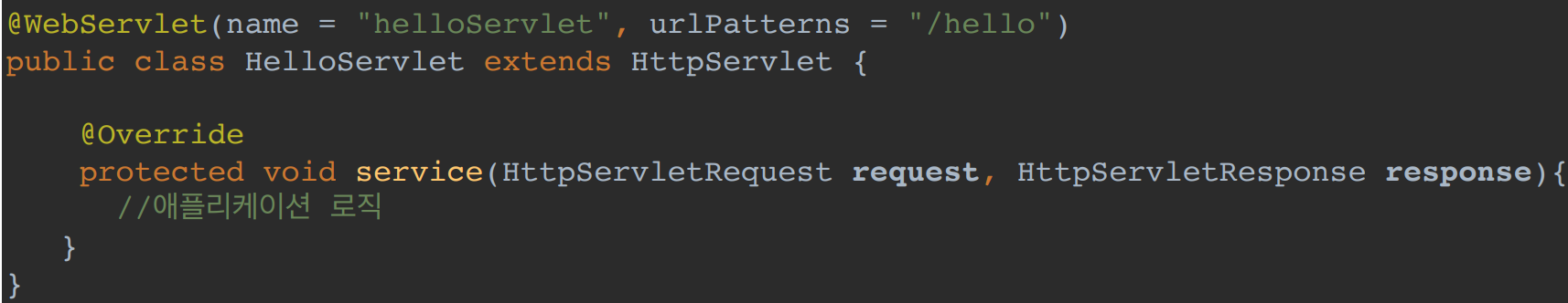 • urlPatterns(/hello)의 URL이 호출되면 서블릿 코드가 실행